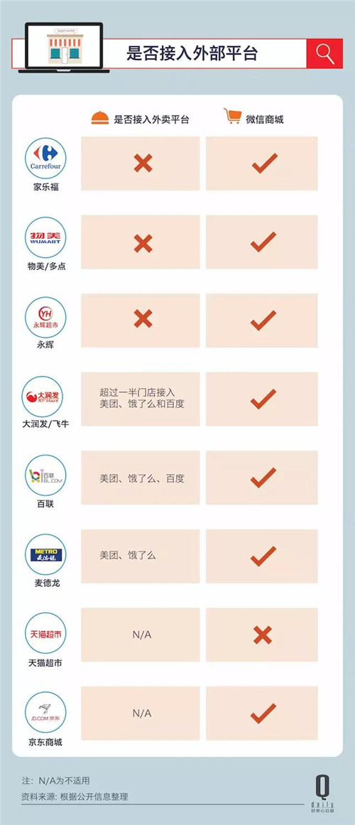 它們也會選擇和第三方電商合作的方式來增加流量。比如在京東于 2015 年認(rèn)購永輝超市 10% 股份之后,永輝超市便在京東入駐了主營的生鮮業(yè)務(wù);百聯(lián)和阿里巴巴在年初宣布達(dá)成戰(zhàn)略合作(雖然線上合作細(xì)節(jié)還沒有展開)。華潤集團(tuán)旗下的華潤萬家、蘇果超市等上萬家線下零售門店接入了美團(tuán)外賣平臺;大潤發(fā)在全國有 230 家門店也接入了三大外賣平臺。