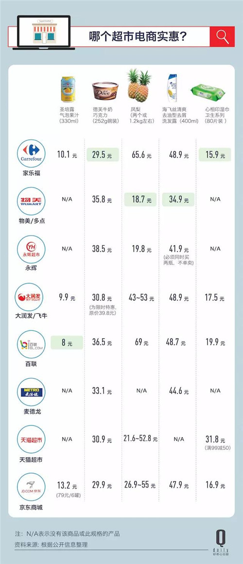 從包裝食品、進(jìn)口食品、生鮮到日化產(chǎn)品,我們隨機(jī)選擇了五個(gè)產(chǎn)品比較了一下價(jià)格。天貓超市和京東的價(jià)格優(yōu)勢不是那么明顯了。天貓超市經(jīng)常會有提價(jià)再打折的情況(知乎有不少人也反映這種情況),比如心相印濕紙巾在天貓上雖然有滿 99 減 50 的折扣,但實(shí)際上它的原價(jià)就是這款產(chǎn)品最便宜的渠道——家樂福的兩倍。從隨機(jī)抽選的 5 個(gè)產(chǎn)品來看,家樂福和物美的價(jià)格比較吸引人。