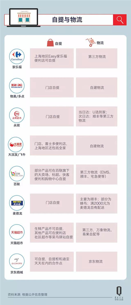 超市有線下門店這些據(jù)點(diǎn)優(yōu)勢,大部分超市電商都不會漏過自提的功能。除了網(wǎng)上家樂福只能在便利店“家樂福 Easy”提貨之外(你暫時(shí)還不能在家樂福超市門店提貨),其實(shí)都是希望把客流引向線下門店。大潤發(fā)/飛牛的自提點(diǎn)更多,除了大潤發(fā)還有同一母公司高鑫零售旗下的喜士多,在上海它還和全家便利店建立合作,消費(fèi)者也可以在那里自提。