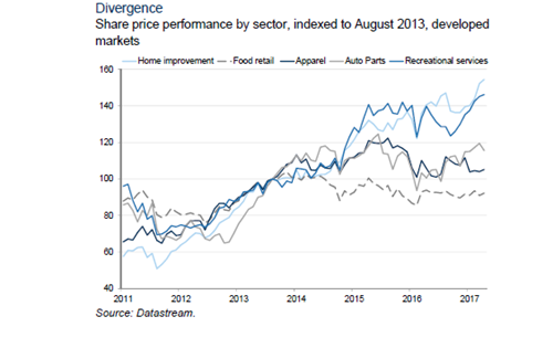 零售商大批破產(chǎn)的同時,一些對電商“免疫”的行業(yè),在過去幾年表現(xiàn)卻明顯優(yōu)于其他消費類行業(yè)。高盛在一篇報告中總結(jié)了以下四類:1、線下體驗型消費(如游樂場);2、“大件”商品和服務(如家具、教育);3、B2B類商品(如工業(yè)零件);4、有監(jiān)管約束的商品(如藥品)。