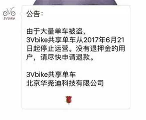 6月21日,共享單車平臺3Vbike對外宣布稱,由于單車大量被盜,即日起停止運營。并提醒沒有退押金的用戶盡快申請退款。
