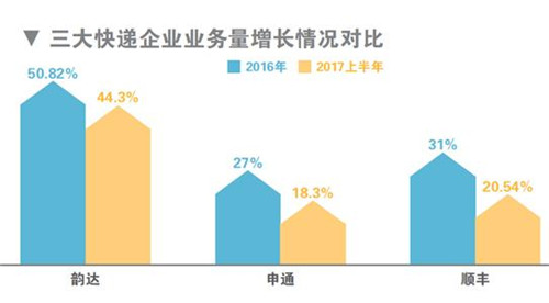 根據(jù)順豐發(fā)布的財報顯示,2017年上半年,順豐控股實現(xiàn)快件業(yè)務量13.73億件,同比增長20.54%;2016年順豐快件業(yè)務量為25.8億件,同比增長31%。而申通快遞2017年半年業(yè)務量為17.26億件,同比增長18.3%;2016年業(yè)務量近32.6億件,同比增長約27%。此外,韻達2017年上半年財報數(shù)據(jù)也顯示,業(yè)務量同比增長44.28%;相比2016年公司業(yè)務量50.82%的增幅有所減緩。