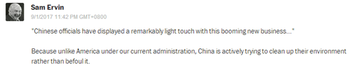 網(wǎng)友Sam Ervin:“‘中國官員對蓬勃發(fā)展的共享單車業(yè)務(wù)表現(xiàn)出柔性的監(jiān)管姿態(tài)?!绹灰粯?,中國正在積極地改善環(huán)境,而不是破壞環(huán)境?!?/font>