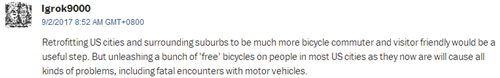 網(wǎng)友Igrok9000:“使用自行車確實利于改善城市和郊區(qū)環(huán)境。但對于美國大多數(shù)城市來說,一下子涌現(xiàn)出大量自行車,會引發(fā)各種各樣的問題,比如與機(jī)動車相撞。”