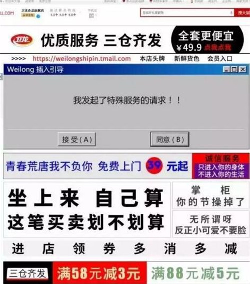 此外,“污”文化也倍它玩得爐火純青。其天貓旗艦店的主頁在某一天以AV網(wǎng)站的畫風面世,簡直污得不要不要的,引得一眾網(wǎng)友以為自己點錯了鏈接。