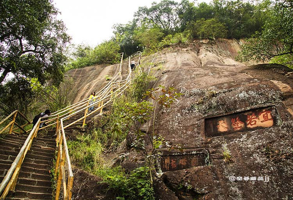 丹梯鐵鎖位于中層風(fēng)景區(qū)至山頂?shù)膽已虑捅谏?,下接“呼吸通天”。原中層到上層,本無(wú)道路可通,后來(lái)經(jīng)人工在這里開鑿石階,旁邊輔以鐵鎖鏈,方成通道,并以“丹梯”命名。