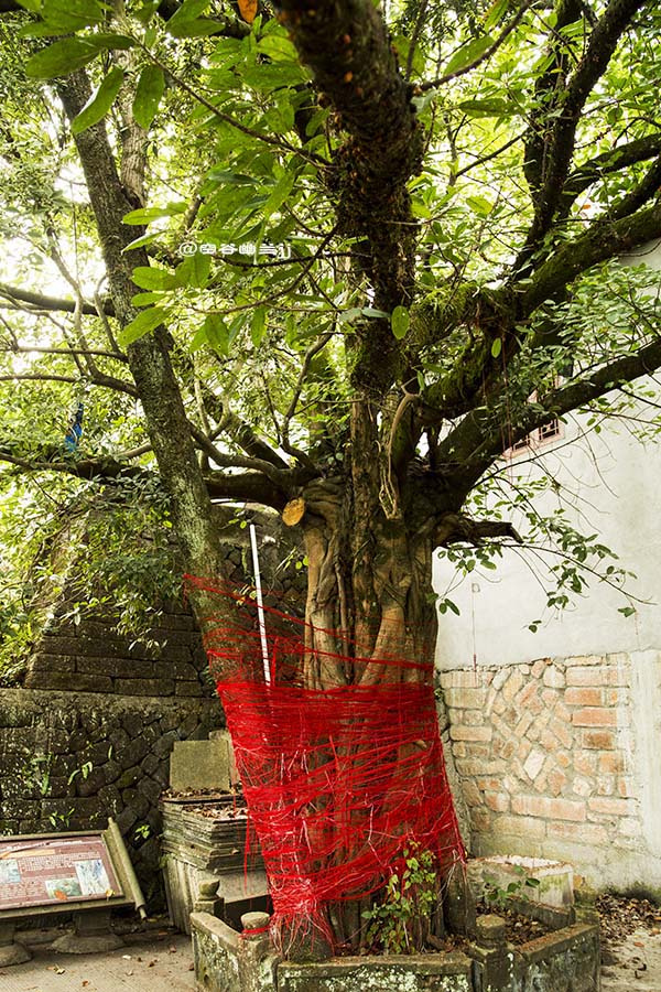 鴛鴦樹生長(zhǎng)在六祖堂舊址旁邊。遠(yuǎn)看,它婷婷玉立如一體,枝葉婆娑不分彼此;近看,則可辨清樹干一里一外,兩種不同科目的樹相互依存。一株四百多歲的百日青,一株一百多歲的筆管榕,它們的樹葉交錯(cuò),各現(xiàn)姿容,好象久別重逢的情侶,互相擁抱著站立在幽靜的山谷間。