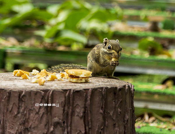 路遇可愛的小精靈,開始它還有些害怕,后來(lái)放在樹樁上食物,它的膽子就大了起來(lái)。