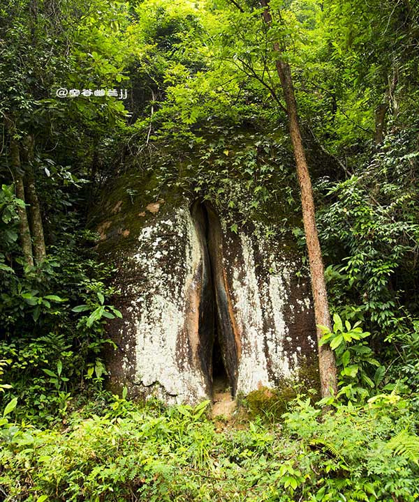 福音峽。這里懸崖相依,兩山并立,相距不過(guò)數(shù)尺,遠(yuǎn)觀之則只見藍(lán)天一線自峽中露出,故名“一線天”。右邊一石,形如草鞋。據(jù)說(shuō):人立在峽中,面向南大喊,若有四聲回音,則此人將有福緣,故此峽名“福音峽”。