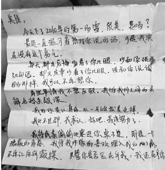 昨天網(wǎng)友“來呀來呀快來打我呀”發(fā)了一條微博,說的是他的學(xué)妹于無意間在教室桌子的縫隙里,發(fā)現(xiàn)了一封情書——情書是一個(gè)男生在2010年寫給一個(gè)叫“美佳”的人。