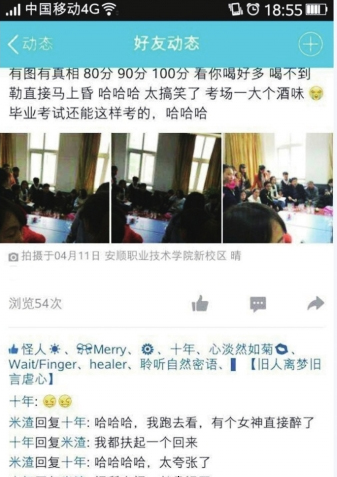 4月12日,報(bào)道了安順職業(yè)技術(shù)學(xué)院一名教師與學(xué)生在辦公室飲酒,并聲稱以喝酒多少來定考試成績之后,引起了該學(xué)院高度重視。據(jù)了解,目前,涉事教師已停職接受調(diào)查。