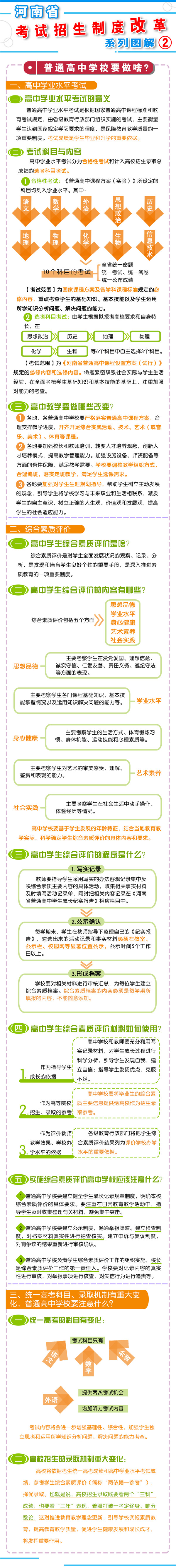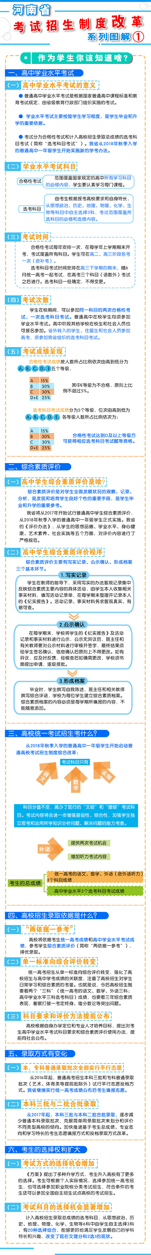 五、2018年秋季開(kāi)始實(shí)施 從2018年秋季入學(xué)的普通高中一年級(jí)學(xué)生開(kāi)始啟動(dòng)普通高??荚囌猩贫染C合改革?! ≡诟母锟荚嚳颇吭O(shè)置上,不分文理科,外語(yǔ)科目提供兩次考試機(jī)會(huì)。考生的總成績(jī)由統(tǒng)一高考的語(yǔ)文、數(shù)學(xué)、外語(yǔ)(含外語(yǔ)聽(tīng)力)3個(gè)科目成績(jī)和高中學(xué)業(yè)水平3個(gè)選考科目考試成績(jī)組成。保持統(tǒng)一高考的語(yǔ)文、數(shù)學(xué)、外語(yǔ)分值不變?! ≡诟母镎猩浫C(jī)制上,推進(jìn)基于統(tǒng)一高考成績(jī)和高中學(xué)業(yè)水平考試成績(jī)、參考學(xué)生綜合素質(zhì)評(píng)價(jià)的多元錄取機(jī)制改革。高校要根據(jù)自身辦學(xué)定位和專業(yè)人才培養(yǎng)目標(biāo),提出對(duì)考生高中學(xué)業(yè)水平考試科目要求和綜合素質(zhì)評(píng)價(jià)使用辦法,提前向社會(huì)公布。 2016年省教育行政部門(mén)出臺(tái)普通高中學(xué)業(yè)水平考試實(shí)施辦法和普通高中學(xué)生綜合素質(zhì)評(píng)價(jià)實(shí)施辦法,從2018年秋季入學(xué)的普通高中一年級(jí)學(xué)生開(kāi)始正式實(shí)施?! ?strong>省教育廳文件通知: 1、關(guān)于印發(fā)《河南省普通高中學(xué)業(yè)水平考試實(shí)施辦法(試行)》的通知 2、關(guān)于印發(fā)《河南省普通高中學(xué)生綜合素質(zhì)評(píng)價(jià)實(shí)施辦法(試行)》的通知