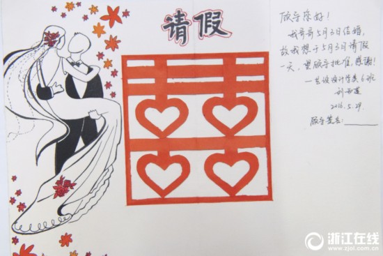 9月19日,在浙江理工大學(xué)藝術(shù)與設(shè)計(jì)學(xué)院,老師顧紅建正在展示學(xué)生們交上來的請(qǐng)假條。這些請(qǐng)假條風(fēng)格多變,充滿創(chuàng)意,有簡筆畫風(fēng)格的,也有抽象的。比如有學(xué)生畫了一班開走的列車和一個(gè)追趕的小人兒,表示趕不上末班車而遲到;有的把假條做成了賀卡,折頁打開一個(gè)大紅喜字,畫上浪漫的婚禮現(xiàn)場,用中英文寫上請(qǐng)假“文案”,原來是參加姐姐的婚禮。顧老師說,讓學(xué)生制作手繪假條,希望學(xué)生們學(xué)會(huì)在生活中用藝術(shù)語言敘事,同時(shí)也想幫學(xué)生們留下大學(xué)生活的回憶。(浙江在線記者 楊曉軒 李翔 于詩奇 攝)