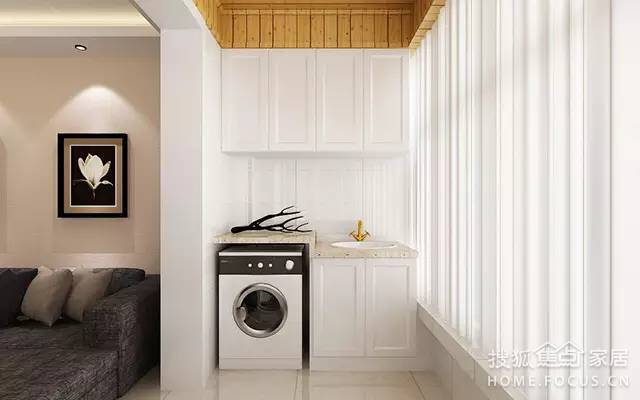 這是一款優(yōu)雅十足的陽臺,戶主把這個放置洗衣機的角落打造成了一個收納性很強的空間,滾筒洗衣機能和側(cè)面的柜子柜完美的貼合,在洗衣機上方又做了一個三開門的柜子,百葉窗洗衣機組合柜,好看的同時可以讓柜子透透氣,防止柜子變難聞氣味。與上面的陽臺放洗衣機效果圖不同,該款洗衣機組合柜無盥洗的區(qū)域,是因為該住宅的陽臺靠近廚房,所以打開右面的落地推拉窗便可直接走進廚房盥洗區(qū)。