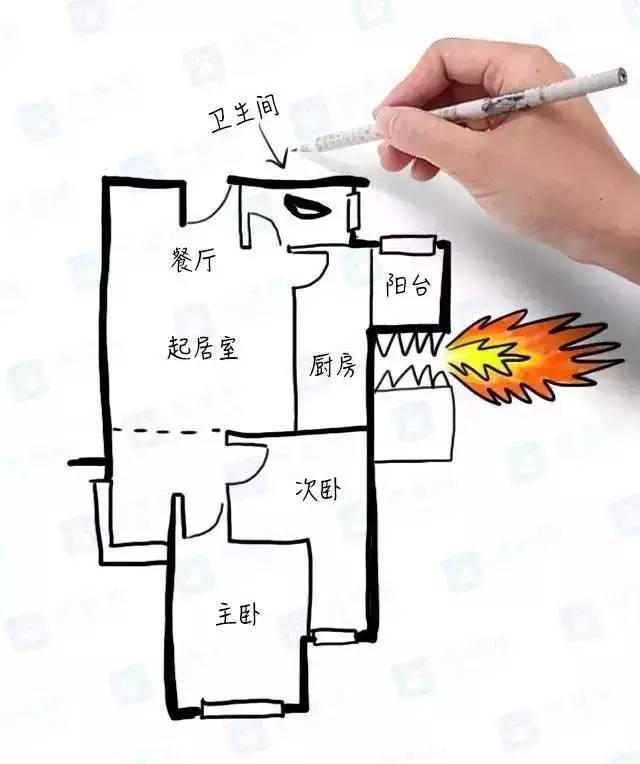 1、這間房入門就是餐廳,旁邊就是衛(wèi)生間,玄關(guān)處過于狹窄,而且廚房正對著衛(wèi)生間,不太衛(wèi)生,而陽臺就在廚房里,導(dǎo)致客廳幾乎沒有采光,功能區(qū)太過緊密。