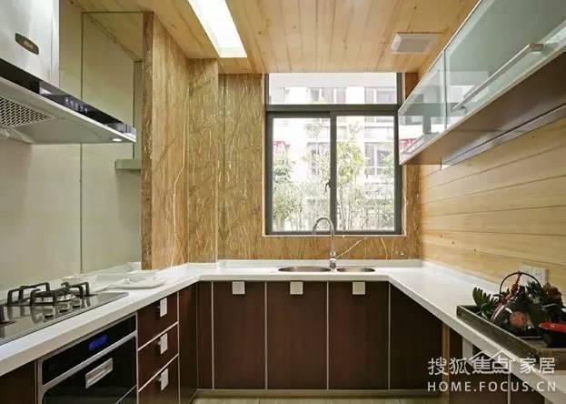 U型櫥柜設(shè)計儲物功能大,左邊吊柜統(tǒng)一采用開放柜與封閉柜不僅美觀,而且方便擺放和儲藏物體,棕色背景與面板形成呼應(yīng),使空間更為溫馨、自然。