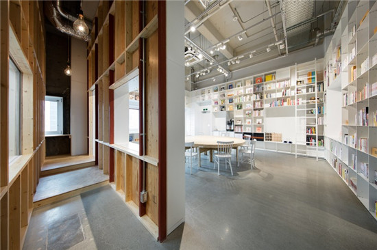 這個建筑工作室通過創(chuàng)建一個既包括圖書館,另外還有一個蛋糕店的空間來完成人們輕松聚集在一起這個愿望。看似毫不相關的兩個空間,只要提供了一個聚集區(qū),就形成了一個互動,兩者就聯(lián)系在了一起。