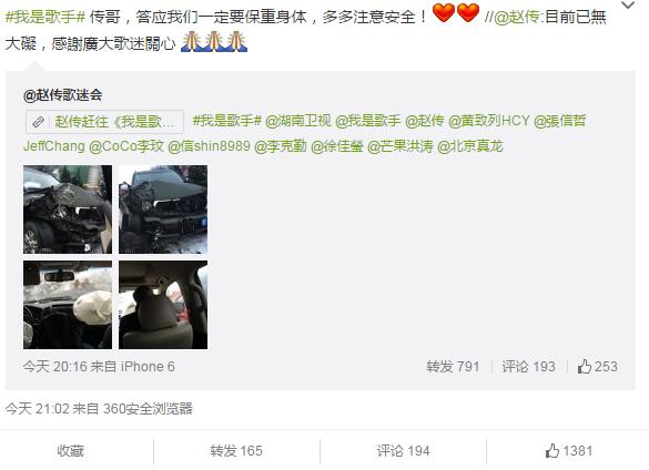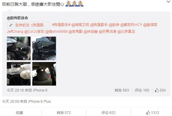 2月4日晚,ID為“趙傳歌迷會”的微博發(fā)布了一篇文章,描述了歌手趙傳在前往《我是歌手》錄制現(xiàn)場的途中發(fā)生車禍的情況。文章發(fā)布后不久就引發(fā)了網友熱議,趙傳本人也轉發(fā)了該微博并寫到:“目前已無大礙,感謝廣大歌迷關心”。確認了消息的真實性。