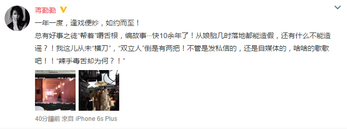近日,網(wǎng)上流傳出一些關(guān)于蔣勤勤曾橫刀奪愛,從女演員手中搶走陳建斌的緋聞。25日,蔣勤勤發(fā)微博辟謠,表示自己已被造謠了十幾年,并否認(rèn)自己曾經(jīng)插足他人感情。蔣勤勤還勸告某些造謠者“歇歇吧”:“一年一度,逢戲便炒,如約而至!總有好事之徒“幫著”嚼舌根,編故事……快10余年了!從娘胎幾時(shí)落地都能造假,還有什么不能造謠?!我這兒從未“橫刀”,“雙立人”倒是有兩把!不管是發(fā)私信的,還是自媒體的,啥啥的歇歇吧?。±笔侄旧鄥s為何?!”