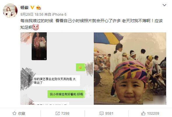 9月29日,楊紫曬出兩張照片,一張為聊天的截圖,一張為楊紫小時候的照片,楊紫寫道:“每當我難過的時候,看看自己小時候照片就會開心了許多。老天對我不薄啊!應該知足啊?!?/p>