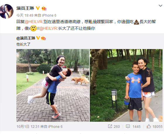 網(wǎng)友看到這一對高顏值的母子后,紛紛留言表示羨慕,而有網(wǎng)友卻在微博下辱罵到:“長大了還不讓他x你?!贝藲^評論也惹怒王琳,并手撕網(wǎng)友回罵道:“別在這里透道德底線,想亂倫趕緊回家,你這個吃屎長大的智障,傻x!”
