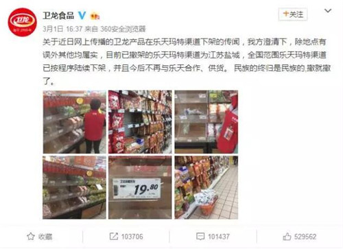 衛(wèi)龍表示,已在全國(guó)范圍從樂天瑪特渠道下架自家產(chǎn)品,斷絕與樂天的合作關(guān)系,并稱“民族的終歸是民族的,撤就撤了”。
