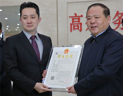 省工商局局長(zhǎng)馬林青(右)為企業(yè)頒發(fā)“22證合一”新版營(yíng)業(yè)執(zhí)照