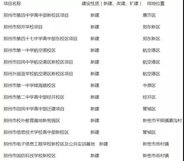 表格中顯示的學校鄭州一中、鄭州外國語學校等知名中學的新校區(qū),家里有孩子該上學的朋友趕緊看看你家附近有沒有學校要新建!