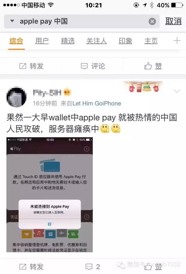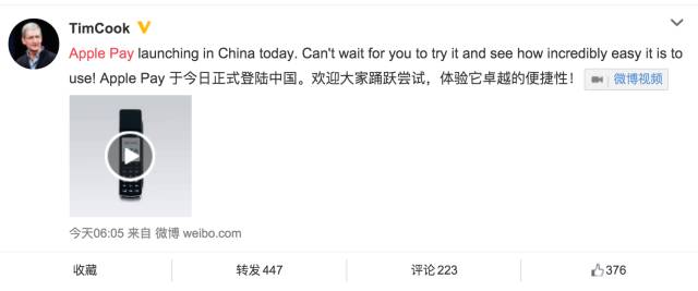 今天早上6點05分,蘋果ceo timcook發(fā)了一條微博宣告Apple Pay正式入華!
