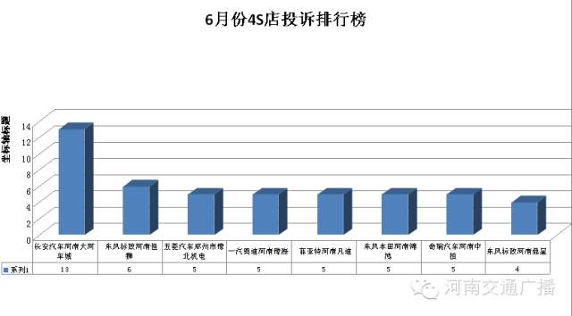 應(yīng)廣大聽眾要求,本次排行榜首次公布了汽車4S店投訴排行,分別是:長安汽車河南大河車城、東風(fēng)標(biāo)致河南恒獅4S店、五菱汽車鄭州市豫北機(jī)電、一汽奧迪河南豫海4S店、菲亞特河南凡迪4S店、東風(fēng)本田河南錦鴻4S店、奇瑞汽車河南中值4S店、東風(fēng)標(biāo)致河南鼎星4S店。