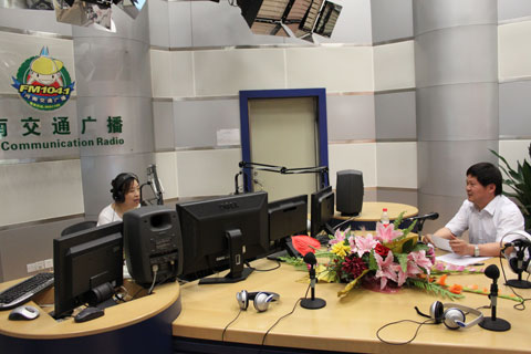 上圖為:巴振東總經(jīng)理與河南交通廣播主持人欣悅(左)在節(jié)目中交流