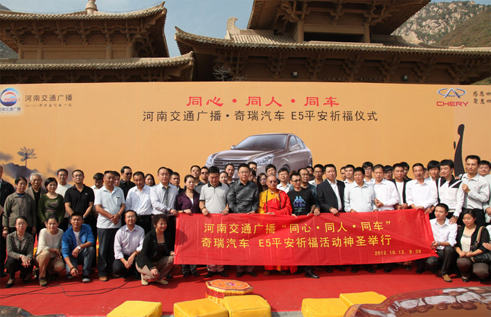公元2012年10月13日(農(nóng)歷八月二十八)9:36正點(diǎn)時(shí)刻,河南交通廣播“同心?同人?同車—奇瑞汽車 E5平安”祈?;顒?dòng)神圣舉行。河南交通廣播為了讓本次祈?;顒?dòng)氣氛更好,在更大范圍內(nèi)傳播、弘揚(yáng)禪宗之精神。特把本次活動(dòng)的主要儀式設(shè)置禪文化氛圍濃郁的“禪宗少林·音樂(lè)大典”內(nèi)神圣舉行。