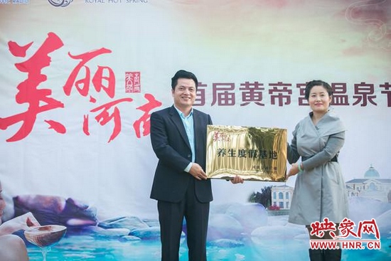 黃帝宮御溫泉被授予美麗河南“養(yǎng)生度假基地”稱號,河南交通廣播總監(jiān)助理李芮女士和銀基國際旅游度假區(qū)總經(jīng)理譚忠山先生進(jìn)行了授牌儀式,光可鑒人的水晶皇后見證了這歷史的一刻。