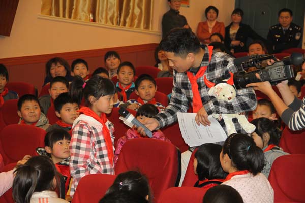 活動現場信息廣播主持人張東為答對問題的小學生派送禮物