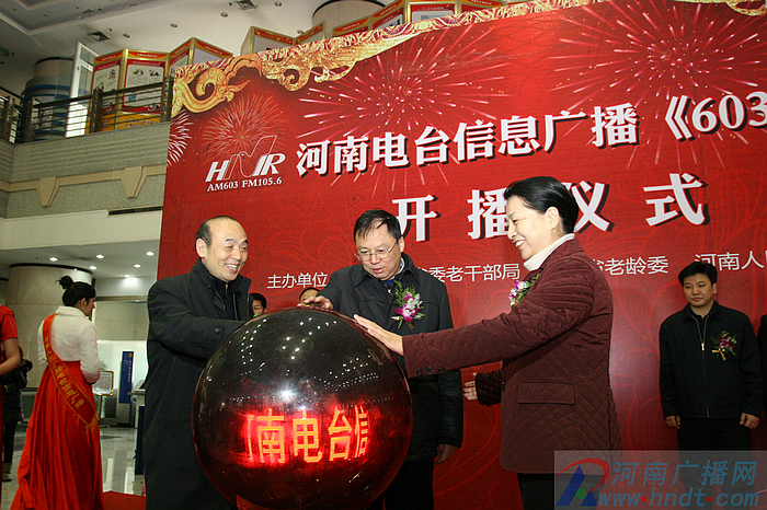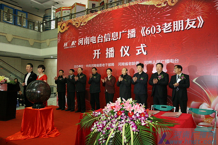 上午9點,開播儀式在河南廣播大廈舉行,中共河南省委老干部局局長汪曉微,中共河南省委宣傳部副部長、省廣電局局長趙景春,省老齡委副書記、省民政廳副廳長常東河共同啟動LED球,宣布《603老朋友》節(jié)目正式開播。省委老干部局副局長李修建、副局長王金貴、省廣電局副局長薛德星、省廣電局副局長王仁海、河南人民廣播電臺臺長李新全、河南人民廣播電臺總編輯張大寶等領(lǐng)導(dǎo)也出席了開播儀式。