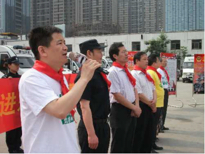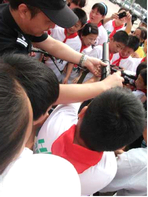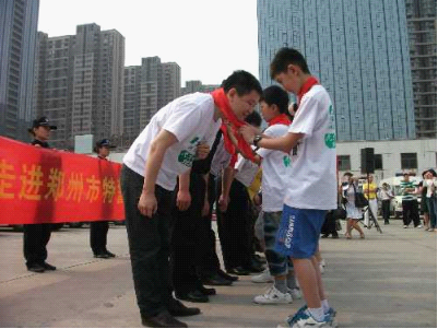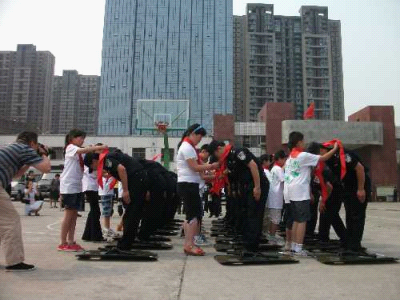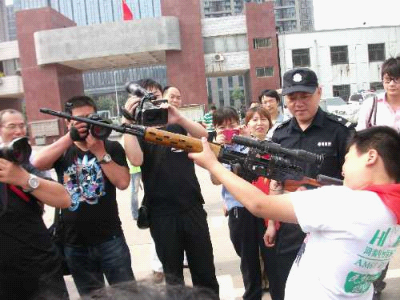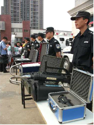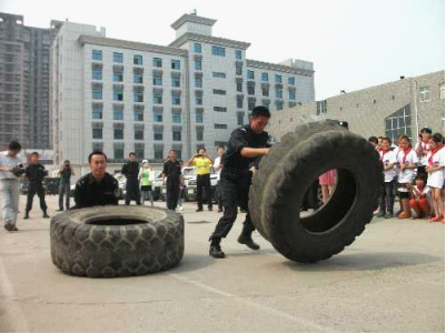 5月31日上午,鄭州市公安局特警支隊大院里熱鬧非凡,35名小學生成為這里的特殊客人。在特警支隊副隊長弋遂勤的帶領(lǐng)下,大家興致勃勃地逐一體驗了各類防暴器械,觀看武警戰(zhàn)士的絕技表演。特警四大隊演示的警棍盾牌術(shù)剛毅雄壯,特警新警大隊的新式擒敵拳颯爽英姿,當備戰(zhàn)“2012全國公安特警比武”的特警猛士一口氣搬起二百斤的巨型輪胎時,大家不由得發(fā)出一陣驚呼!