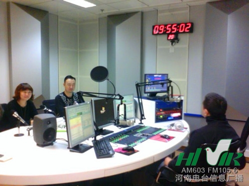 信息廣播主持人和臺(tái)技術(shù)人員在直播室