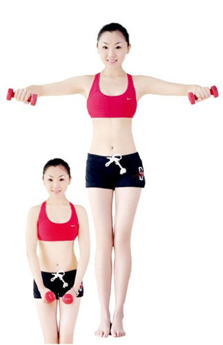 動(dòng)作要領(lǐng):雙手握啞鈴放于身體前,膝蓋微微彎曲。手臂慢慢向兩側(cè)抬起呈半圓形,大臂盡量向后靠,注意腕關(guān)節(jié)要低于肘關(guān)節(jié),肘關(guān)節(jié)要低于肩關(guān)節(jié)。返回至初始位置,重復(fù)20~30次,每回至少做4組,每組之間要有間隙。
