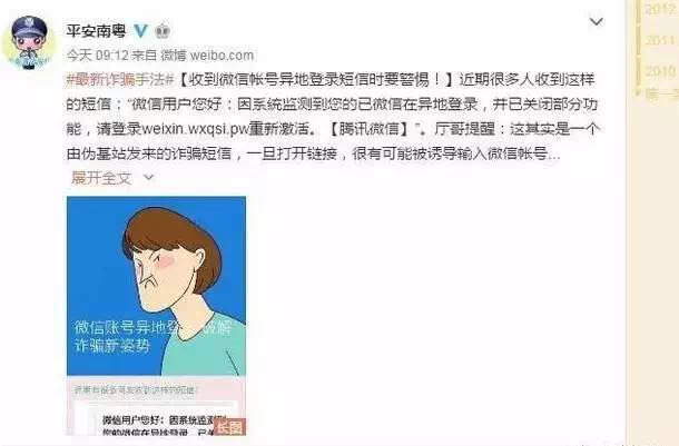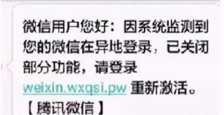 #最新詐騙手法#【收到微信帳號(hào)異地登錄短信時(shí)要警惕!】近期很多人收到這樣的短信:“微信用戶您好:因系統(tǒng)監(jiān)測(cè)到您的已微信在異地登錄,并已關(guān)閉部分功能,請(qǐng)登錄weixin.wxqsi.pw重新激活?!掘v訊微信】”。廳哥提醒:這其實(shí)是一個(gè)由偽基站發(fā)來(lái)的詐騙短信,一旦打開(kāi)鏈接,很有可能被誘導(dǎo)輸入微信帳號(hào)、微信密碼、支付密碼、驗(yàn)證碼等,后果不堪設(shè)想……