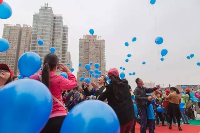 除了有藍(lán)色的氣球外,每個(gè)參與活動(dòng)的人都穿著藍(lán)色的服裝,頭戴藍(lán)色帽子,手系藍(lán)色絲帶,整個(gè)活動(dòng)現(xiàn)場成了一片藍(lán)色的海洋。