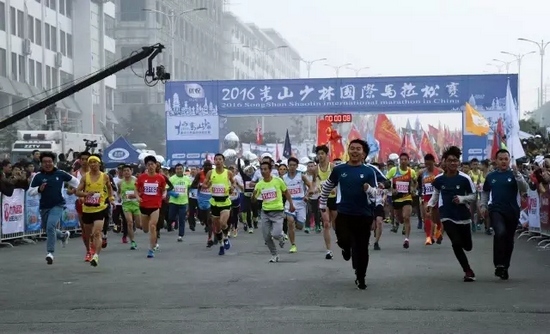 11月13日上午,隨著2016嵩山少林國際馬拉松賽發(fā)令汽笛鳴響,來自世界16個國家和地區(qū)的近15000名跑友跑出起點,瞬間匯聚成流動的七彩人潮,為嵩山美景增架起一道絢麗的彩虹。