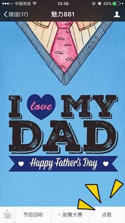 本周日就是父親節(jié)了。平時(shí)向爸爸們表達(dá)情意的機(jī)會(huì)可能不多,趁著節(jié)日,你可別落下。特意給親愛的老爸準(zhǔn)備了一份禮物,6月14日——6月16日,點(diǎn)擊菜單欄中的“點(diǎn)歌”或直接點(diǎn)擊本文底部的閱讀原文,進(jìn)入點(diǎn)歌互動(dòng)頁后點(diǎn)擊“立即點(diǎn)歌”,填寫并提交姓名、手機(jī)號(hào)、所點(diǎn)歌曲名稱、以及你想對父親說的話。
