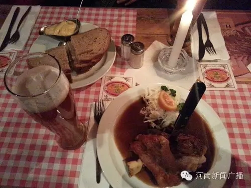 到了德國,當然要吃一頓德國餐:肘子……配上德國啤酒,第一口下去,哭了……沒有饅頭不說,甚至沒有米飯……要在蒜瓣都沒有的情況下,吃完這樣一個肘子,作為河南人的我,真的是很痛苦……