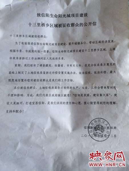 浉河區(qū)政府下達的征收公開信 吳彥飛 攝