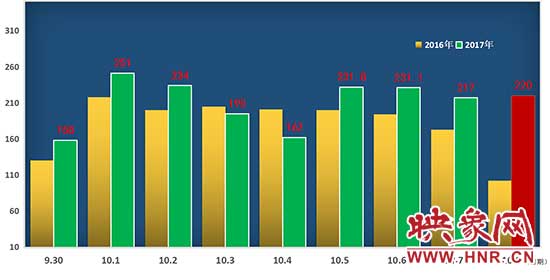 據(jù)悉,10月1日零時至10月7日24時,全省高速公路出口累計通行車輛1522.04萬輛,與2016年同比增長10.3%,其中:小型客車1346.27萬輛,占88.45%,免通行費9.3億元;“綠色通道”車輛14.75萬輛,免通行費6295.31萬元。