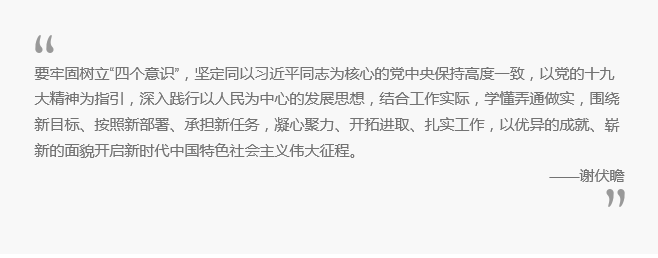 謝伏瞻說,黨的十九屆一中全會(huì)選舉習(xí)近平同志為黨的總書記,這是全黨全國(guó)各族人民的共同心愿,習(xí)近平總書記是全黨擁護(hù)、人民愛戴、當(dāng)之無(wú)愧的黨的領(lǐng)袖。大家要切實(shí)增強(qiáng)“四個(gè)意識(shí)”,同以習(xí)近平同志為核心的黨中央保持高度一致。中國(guó)特色社會(huì)主義進(jìn)入了新時(shí)代,這是一個(gè)重大的政治判斷,為我們國(guó)家發(fā)展標(biāo)明了準(zhǔn)確的歷史坐標(biāo)和發(fā)展方位。