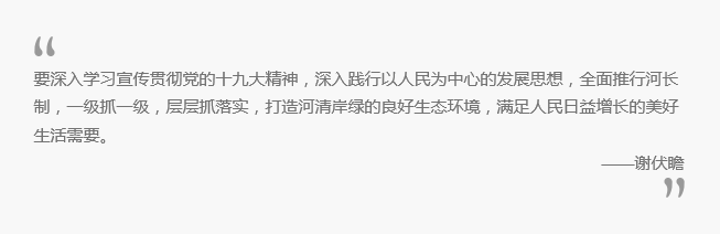 謝伏瞻指出,我們要認(rèn)真學(xué)習(xí)宣傳貫徹十九大精神,按照省委省政府制定的方案,全面落實(shí)河長(zhǎng)制,強(qiáng)化屬地責(zé)任,健全長(zhǎng)效機(jī)制,細(xì)化措施辦法,嚴(yán)格追責(zé)問責(zé),保護(hù)水資源,治理水污染,修復(fù)水生態(tài)。各級(jí)領(lǐng)導(dǎo)要負(fù)責(zé),各項(xiàng)制度要落地,各級(jí)政府要投入,各項(xiàng)工作要扎實(shí),合力攻堅(jiān),真正形成人人參與、共建共享的良好局面。