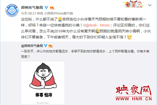 面對(duì)任性的雪花,網(wǎng)友們也已不再等雪,紛紛轉(zhuǎn)去玩鄭州市氣象局小編。