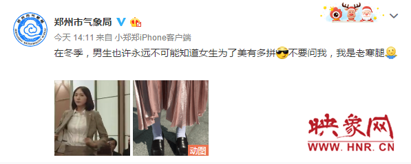 然而,就在記者發(fā)文前“鄭州市氣象局”的最后一篇微博中,氣象局小編面對(duì)完全不配合的暴雪,已徹底棄療,不再談?wù)撊魏闻c雪有關(guān)的話題,反而談?wù)撈鹋灾b,甚至把自己“老寒腿”的秘密也共享給大家。