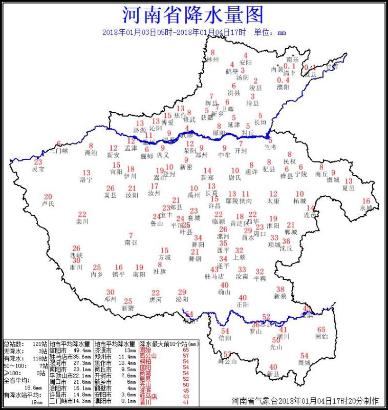 3-4日,河南自西向東出現(xiàn)明顯降雪過程,除豫東北部分縣市外,全省其它地市均出現(xiàn)大到暴雪,中南部大部分地區(qū)出現(xiàn)20毫米以上大暴雪,其中信陽、駐馬店和南陽部分縣市出現(xiàn)30毫米以上特大暴雪。全省平均降雪量18毫米,本次降雪具有降雪量大、積雪深厚、多站日降雪量突破1月歷史極值的特點(diǎn)。